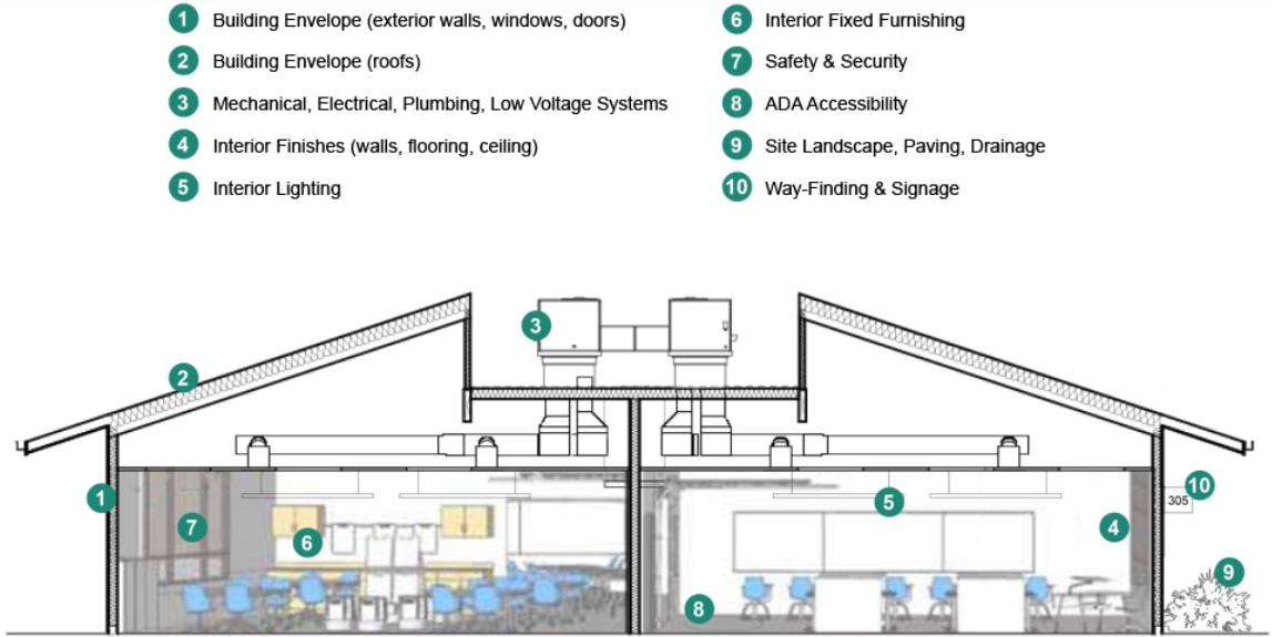 As part of the FMP, facility condition assessments are conducted by a multi-disciplinary team of architects, engineers and consultants. The physical site walks encompass a building-by-building system examination of existing conditions at each school site. This includes interiors, exteriors, mechanical, electrical, plumbing, technology and site / civil elements of each campus.